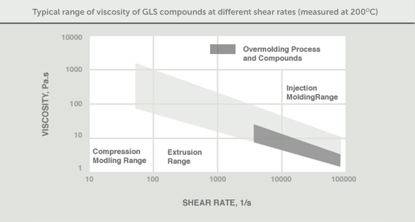 GLS overmolding formulations have relatively low viscosity characteristics. They are shear responsive and their viscosity is reduced when they are processed at high shear rates. This helps them flow into thin-walled sections commonly encountered in overmolding. The figure below illustrates the effect of shear rate on the viscosity of GLS overmolding TPEs. For the viscosity of a specific grade, refer to the individual Product Technical Datasheet.